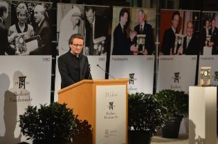 " ... Ich bin froh, dass in dieser Urkunde steht 'Gedenkstätte Berlin-Hohenschönhausen, vertreten durch ihren Direktor', denn ich nehme diesen Preis nur stellvertretend entgegen. ... Und das, was in den letzten Jahren dort geleistet worden ist, habe ich vor allem den Mitarbeitern zu danken. Und ganz besonders den Zeitzeugen, den früheren Gefangenen, die dort die Besucher durchführen. ..."