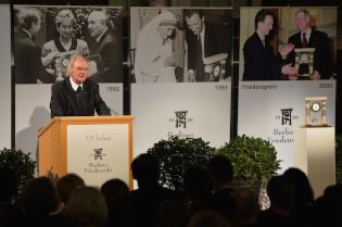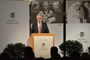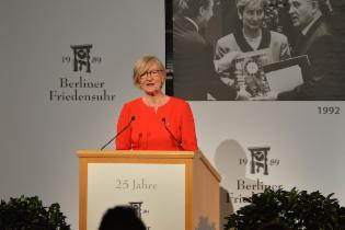 "... Und mit der gemeinschaftlichen Übergabe des Friedenspreises „Berliner Friedensuhr“ an Ulrike Poppe und die Gedenkstätte Berlin-Hohenschönhausen, kommen wir im 25. Jahr ihres Bestehens zurück nach Hause. Zurück nach Berlin. . ..."
